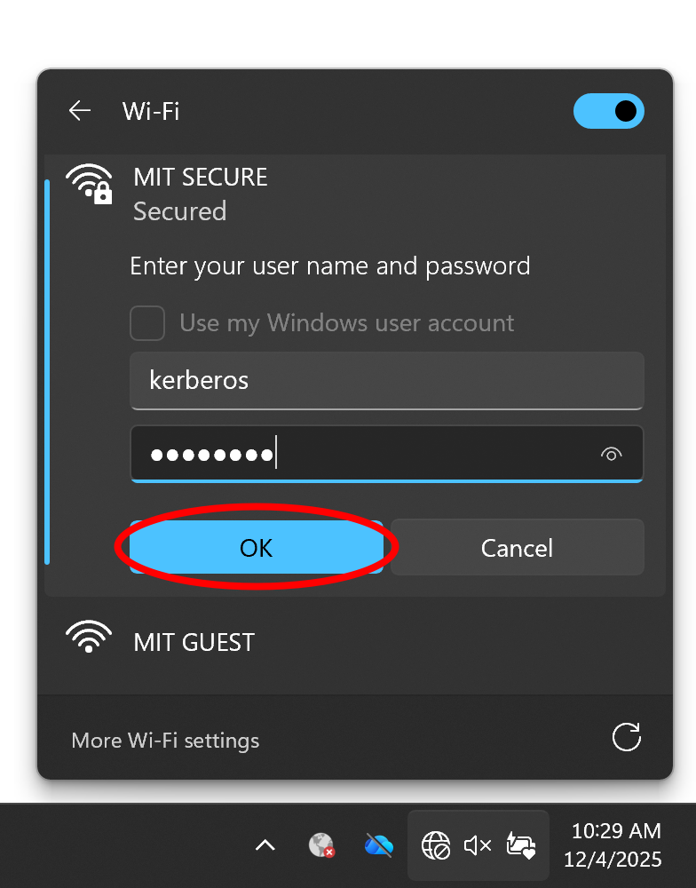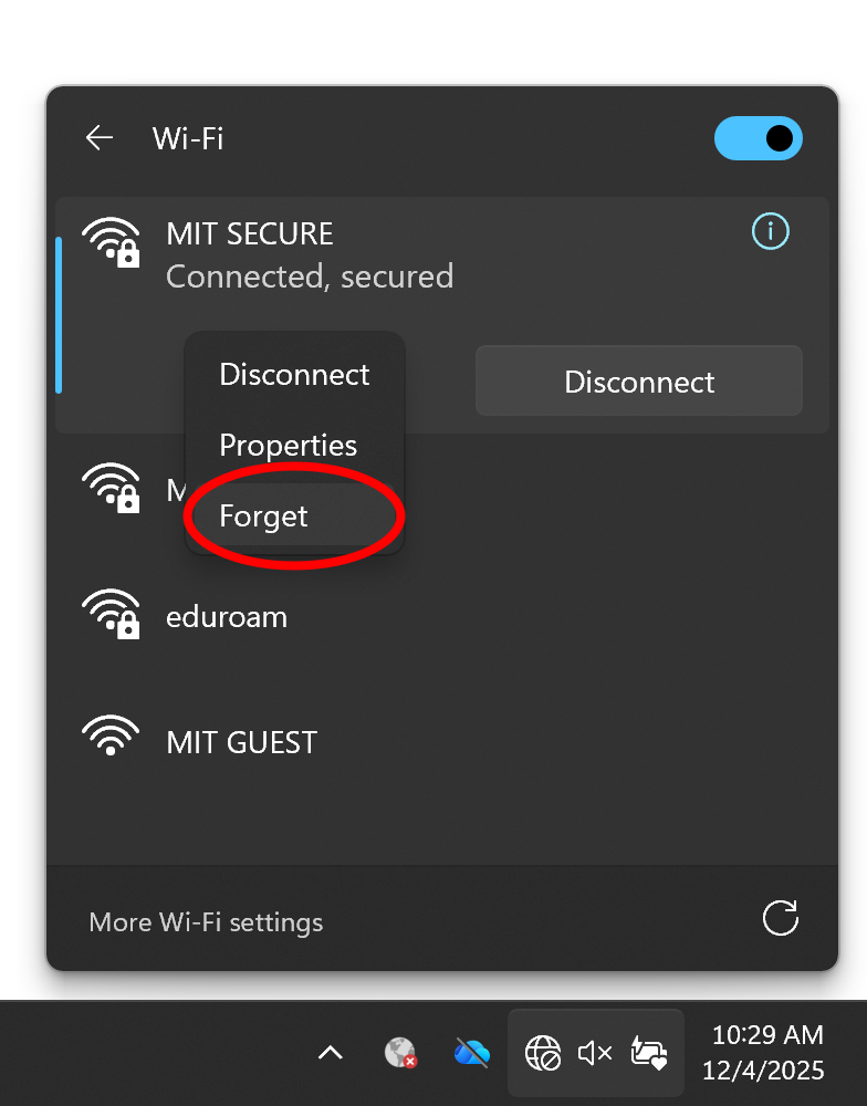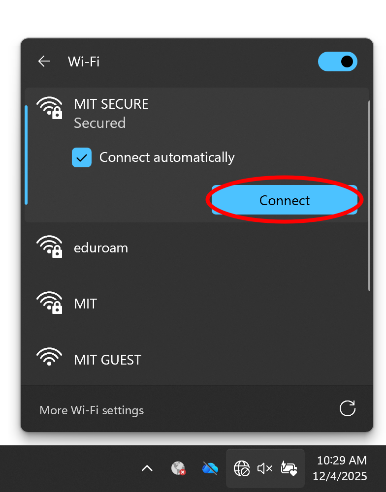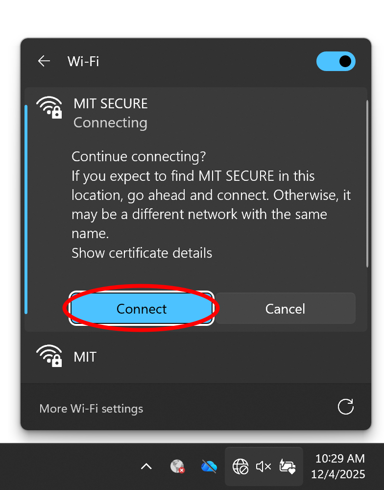If you are still experiencing difficulties connecting to MIT Secure, repeat steps 4-8 again or try connecting to the MIT Wi-Fi..